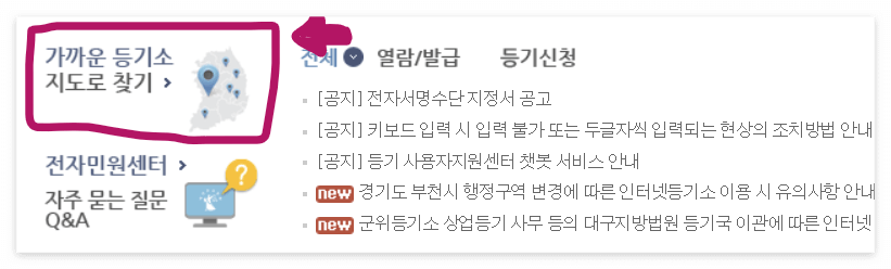 위 버튼을 클릭하시면 등기소 홈페이지로 접속됩니다. 홈페이지 중간에 보시면 가까운 등기소 지도로 찾기 가 보여요. 여기를 클릭하시면 가까운 곳을 찾을 수 있답니다.