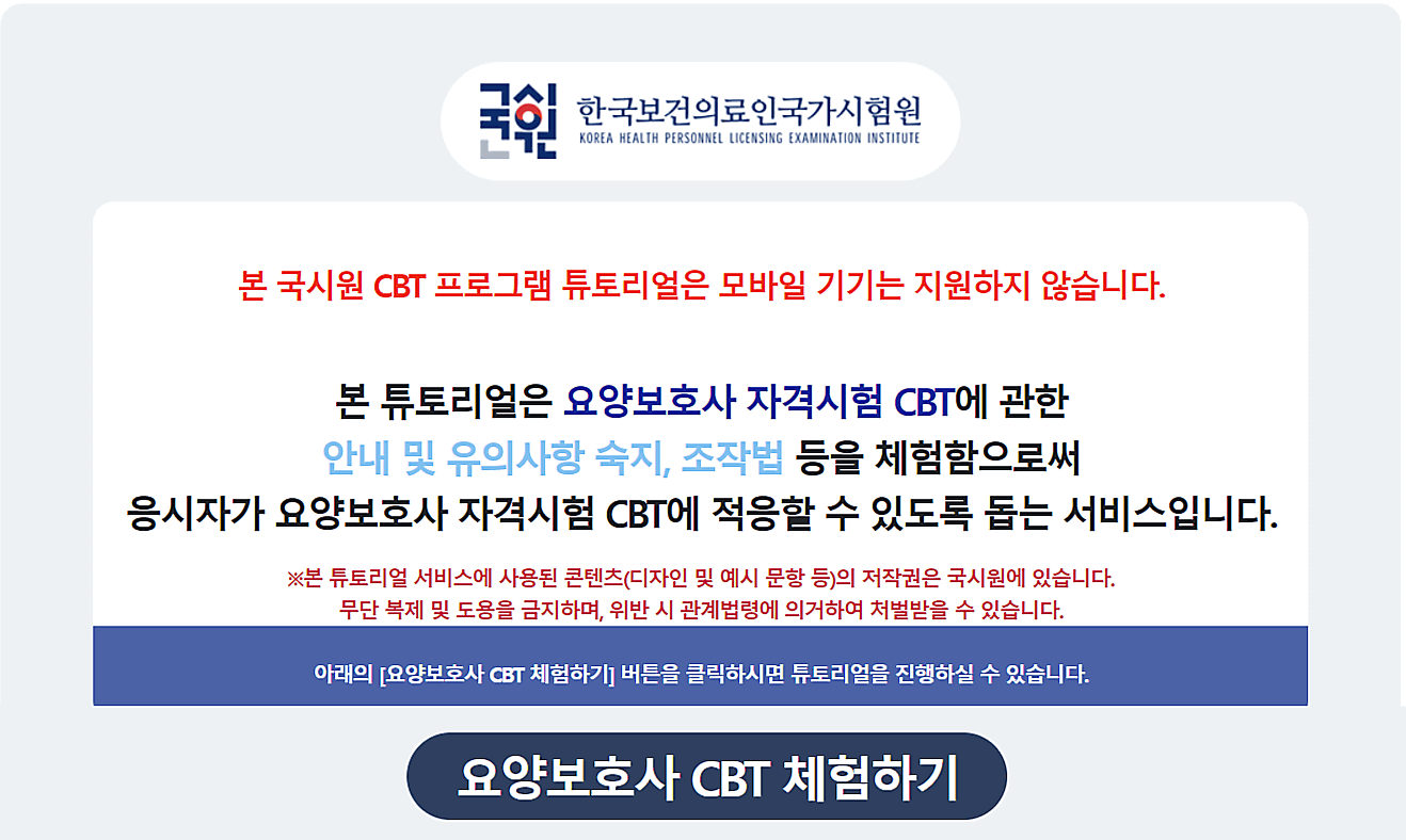 본 튜토리얼은 요양보호사 자격시험 CBT에 관한 안내 및 유의사항 숙지, 조작법 등을 체험함으로써 응시자가 요양보호사 자격시험 CBT에 적응할 수 있도록 돕는 서비스입니다.